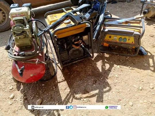 During the operation, fifteen suspects actively engaging in illegal mining activities were arrested. The suspects are, Tahiru Ibrahim (24), Shaibu Idrissu, (23), Boateng Emmanuel (27), Jamon Kwaku Samuel (21), Yaro Patrick (29), Kofi Boakye (21), Gubong Mathew (45), Fatawu Zackari Seidu (26), Abdul Malik Seidu (22), Dauda Tahiru (23), Sampson Grace (21), Boolangkpuo Freda (24), Arima Hagar (26), Kwarteng Vasco (30), Kwame Adutwum (24).