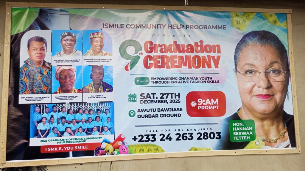 Former Minister of Foreign Affairs and also the Former MP for the Awutu Senya West Constituency, Patron of I – Smile Community Help Program in Awutu Bawjiase, Hannah Serwaah Tetteh, has charged the current MP for the Constituency(Hon Gizella Agbotui Tetteh) and the Awutu Senya District Assembly to find everything possible to make Awutu Bawjiase an “Industrial Fashion Hub” where companies who may wish to Sew a dress will turn up to the constituency going into 2026.