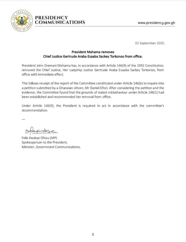President John Dramani Mahama has removed suspended Chief Justice Getrude Torkonoo from office, mybrytfmonline can confirm.